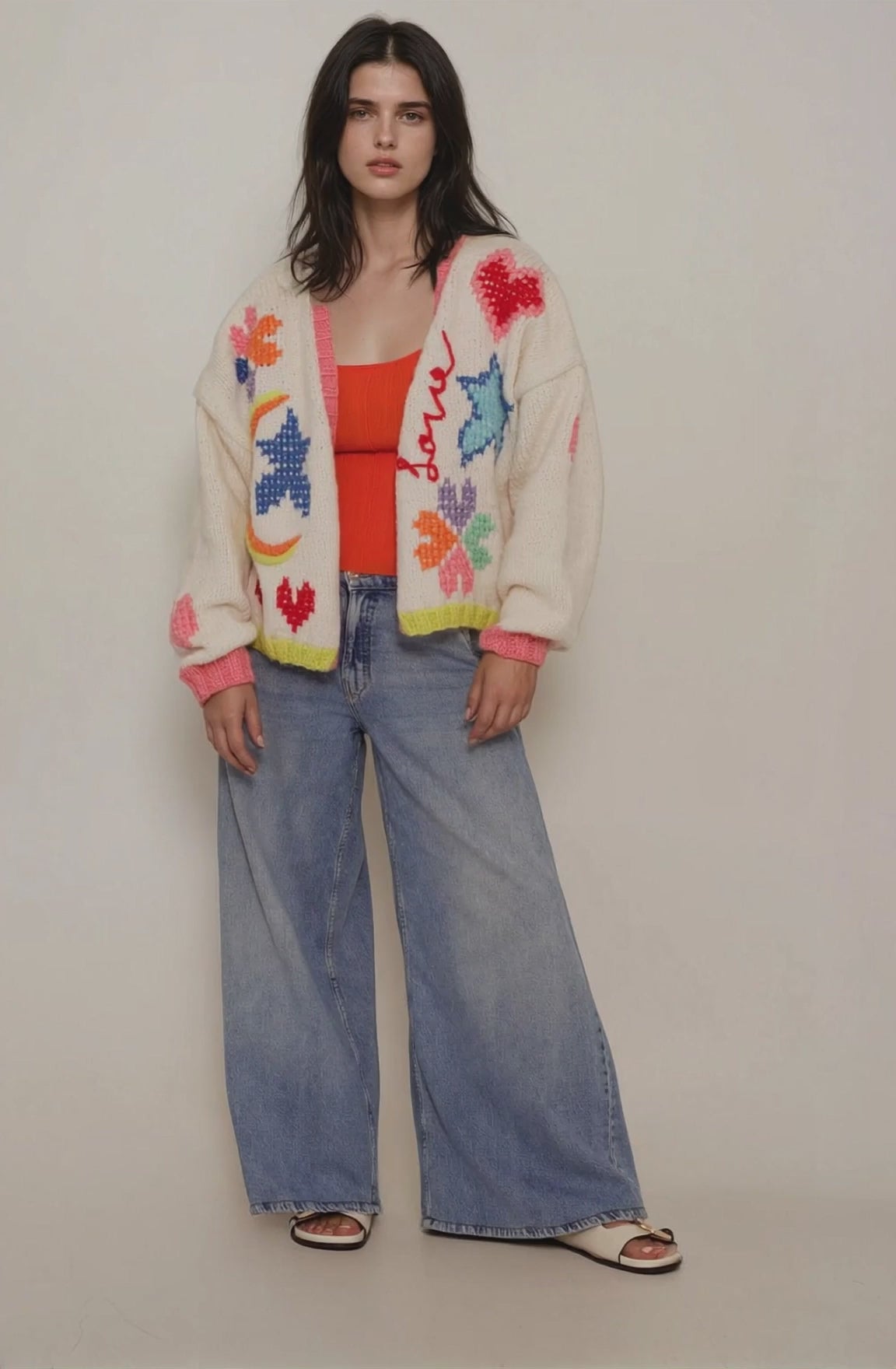 A joyful ode to craftsmanship and color, the All You Need is LOVE Jacket is handknitted with luxurious yarns and adorned with handmade embroidery that feels like a warm hug from the universe. Stars, moons, hearts, and flowers come together in a playful mosaic, stitched with care and bursting with feel-good energy.