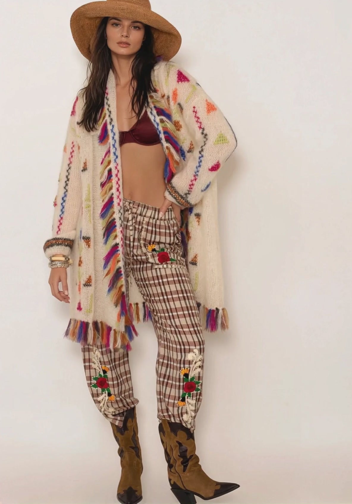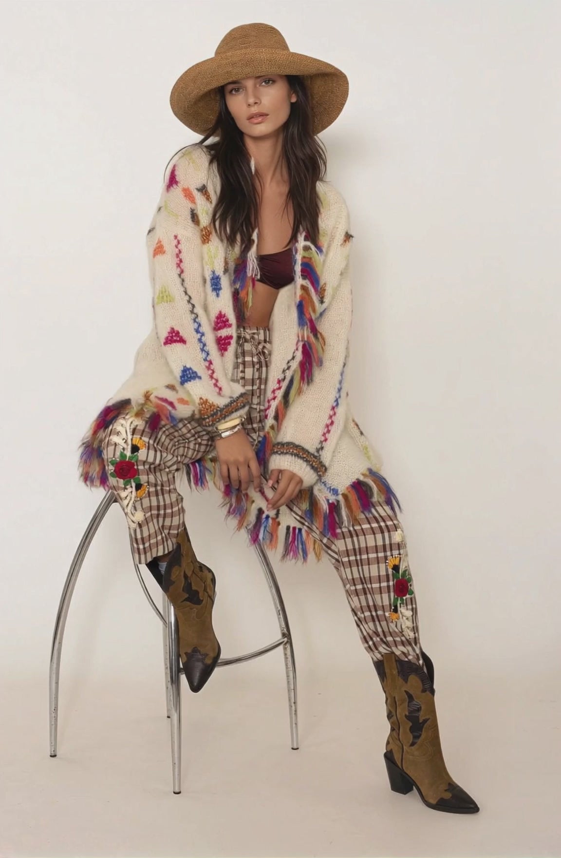 Donde el alma bohemia se encuentra con el estilo western, la chaqueta Rider Mohair es una declaración de lujo sin esfuerzo. Tejida a mano con el mohair más suave y adornada con intrincados bordados de punto de cruz, fusiona la artesanía con una actitud audaz y libre.