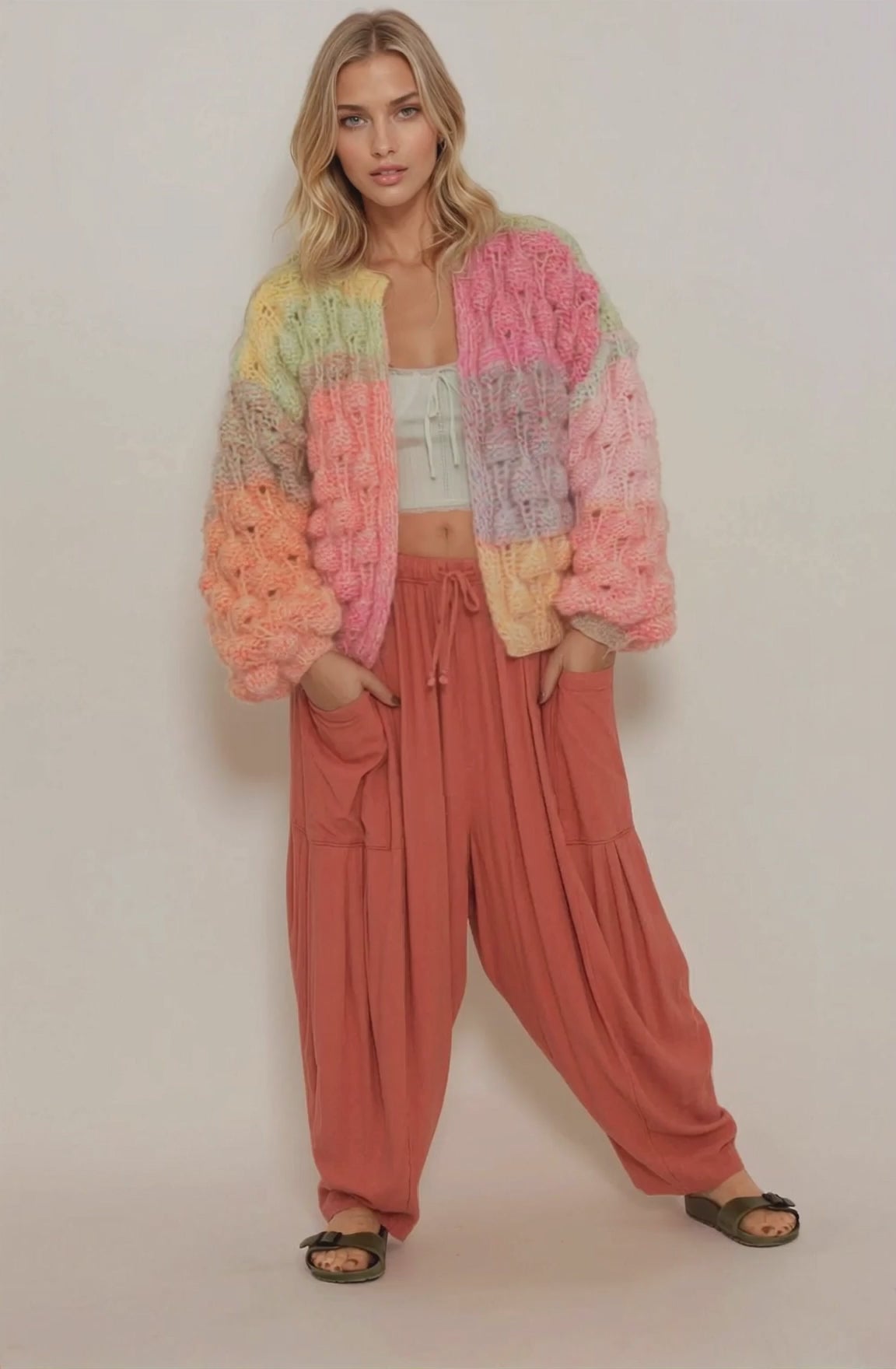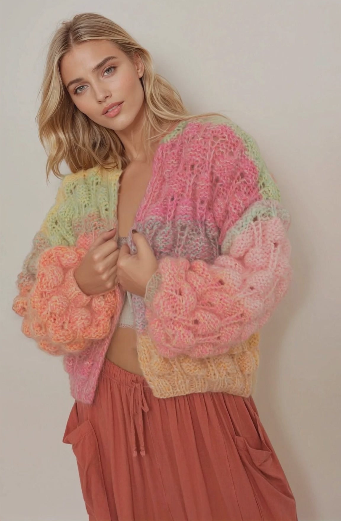 Dai il benvenuto a Leora in “Sunny” – il tuo nuovo capo statement preferito. Lavorato a maglia a mano in morbide e allegre tonalità pastello di rosa, pesca, limone e menta, questo cardigan porta subito luminosità a qualsiasi look. Le maniche lavorate a pallini sono la vera protagonista, aggiungendo texture e un tocco giocoso alla silhouette classica.