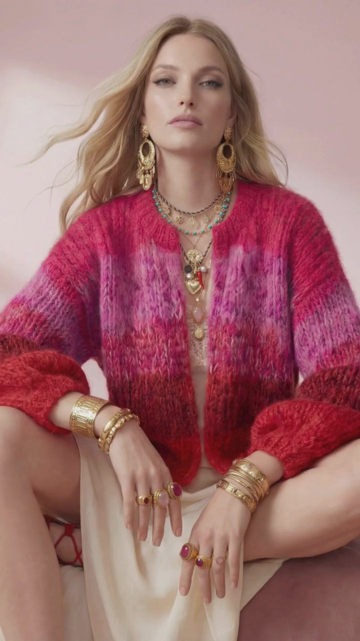 The Moon Jacket in Berry Heat blends deep raspberry, fuchsia and ember red into a soft, luminous mohair surface that feels almost lit from within. The airy hand-knit structure creates volume without weight, giving the silhouette its relaxed drape and sculptural sleeves.