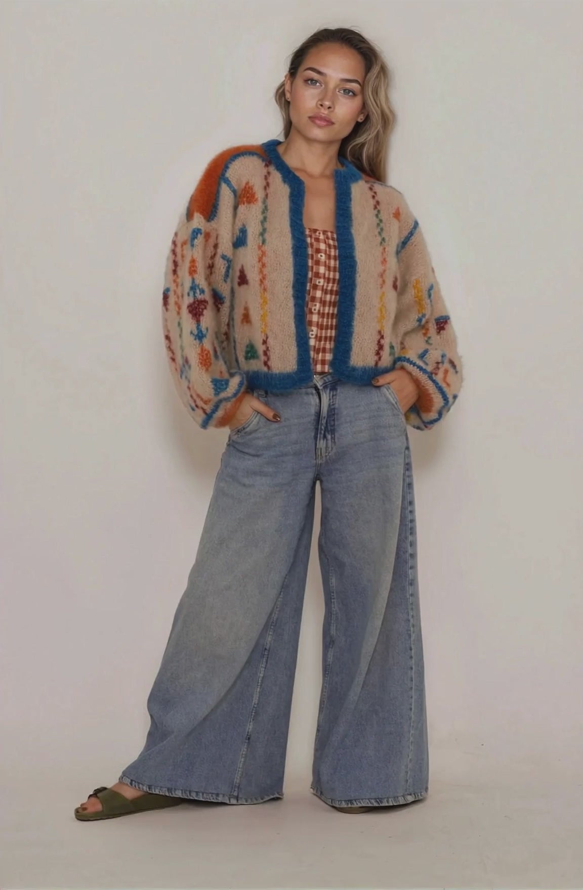 Knitted in a dreamy mohair blend and adorned with vivid handmade embroidery, this edition features a striking royal blue trim and bold pops of saffron, mandarin, cerulean, and deep burgundy. Each symbol is hand-stitched, making every piece one of a kind. An artistic piece to treasure season after season.